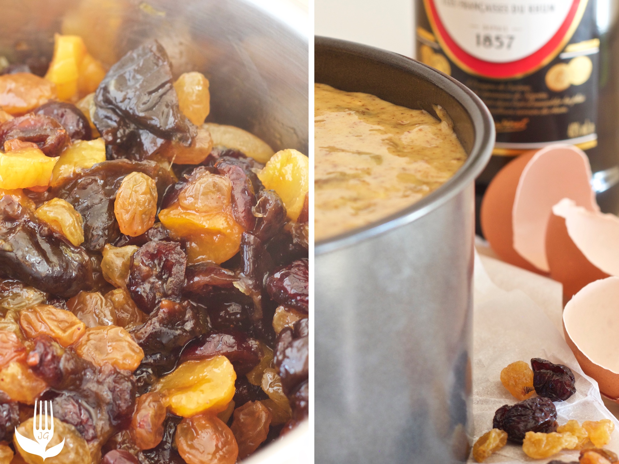 2 – Dans une casserole, faire chauffer l’ensemble des fruits secs (abricots, pruneaux, raisins, cramberries) avec le zeste et le jus de l’orange, le jus du citron, le miel, 50ml de l’alcool choisi. Laisser frémir pendant 5 mn puis refroidir.