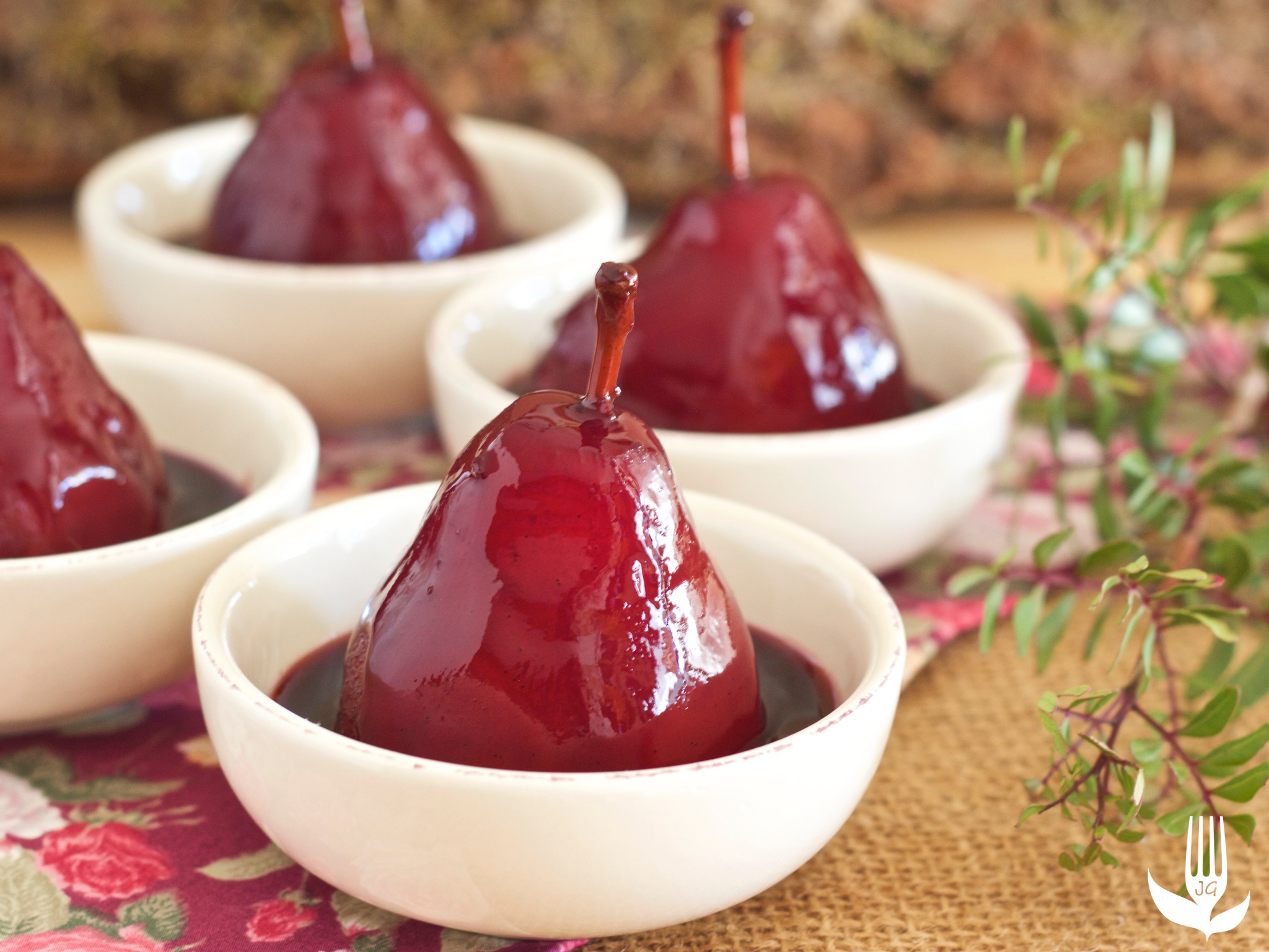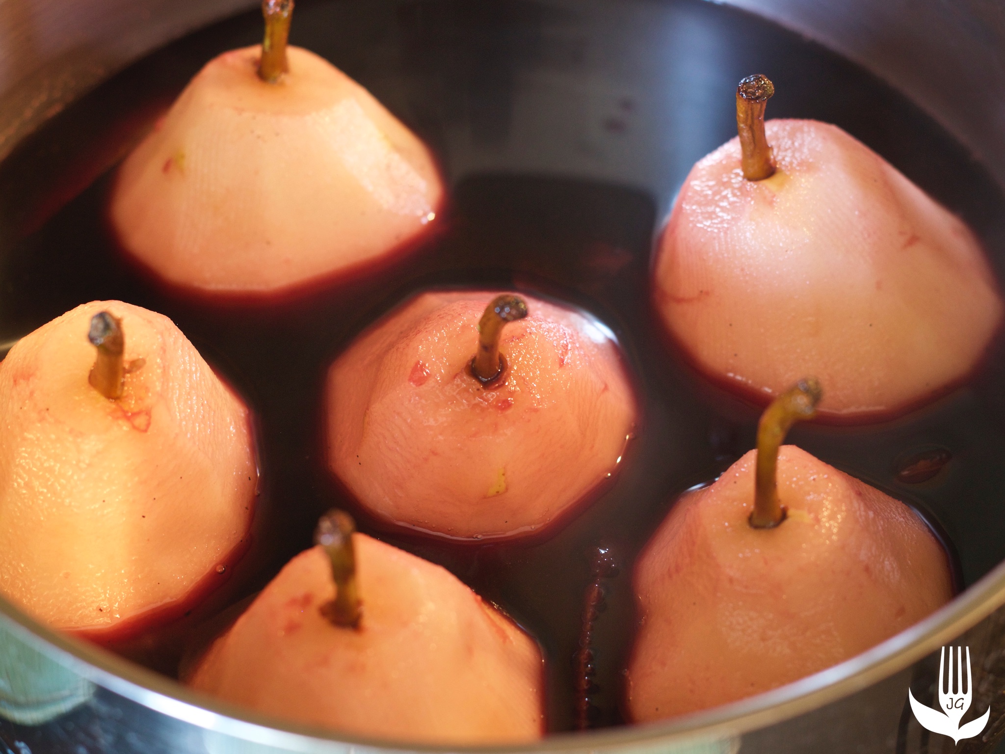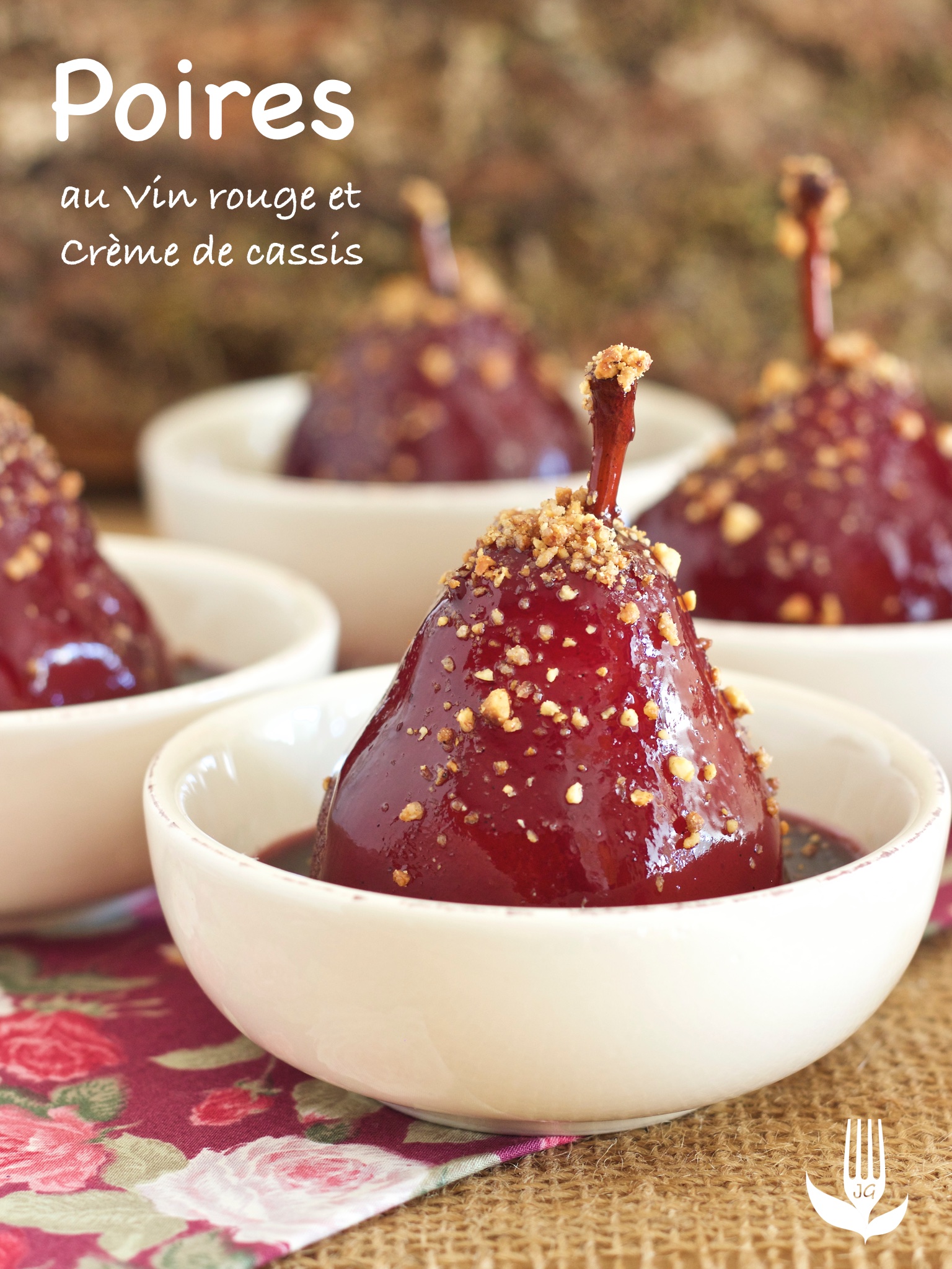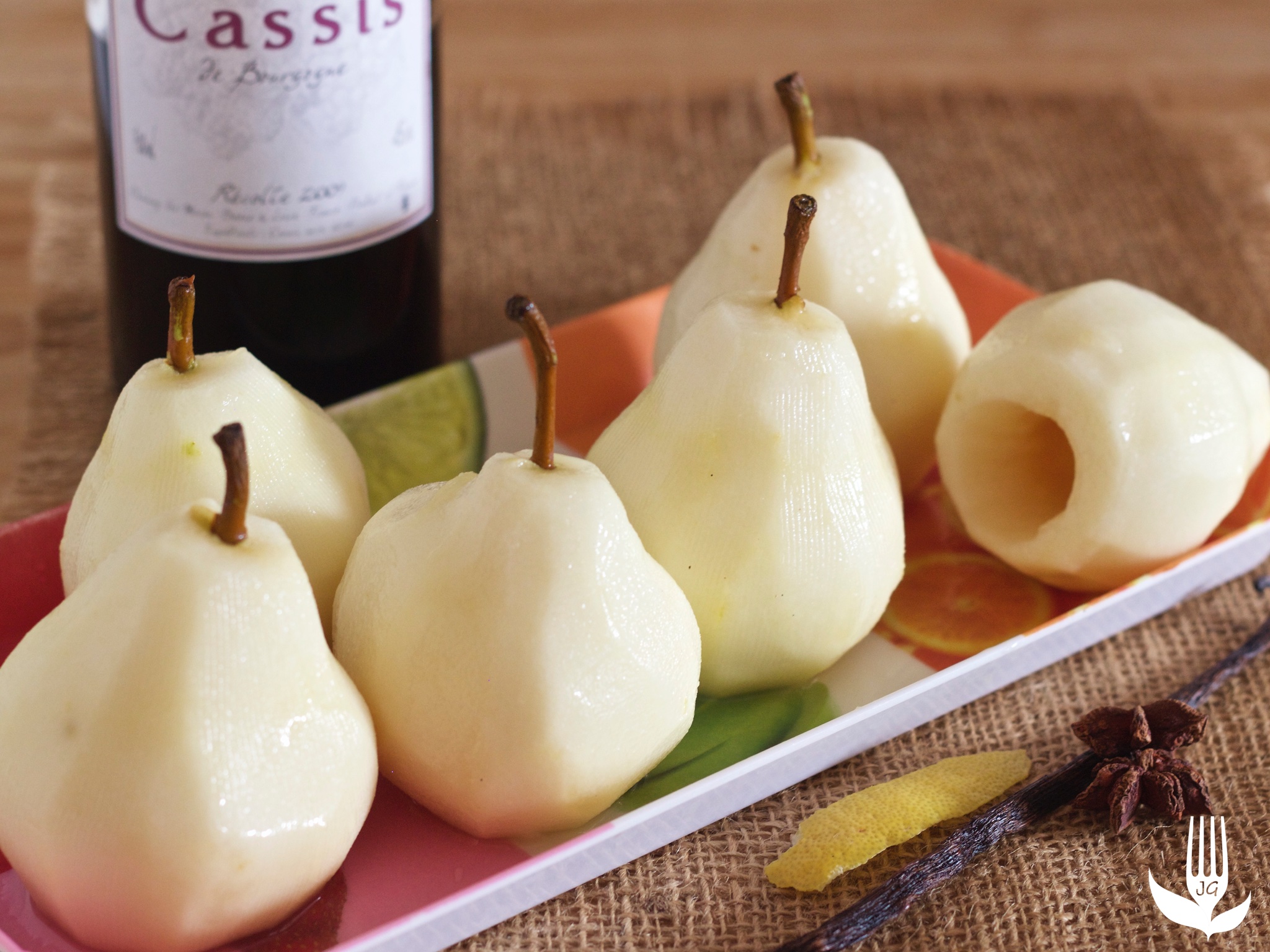 Profitez de la saison des poires pour réaliser cette recette, à la fois simple et rapide. Les poires sont pochées dans un mélange de vin rouge, de crème de cassis et d’épices. Dans un 2ème temps, le sirop est épaissi avec un peu de fécule de maïs. On obtient alors un nappage très parfumé, délicatement fruité avec la crème de cassis et intensément brillant.